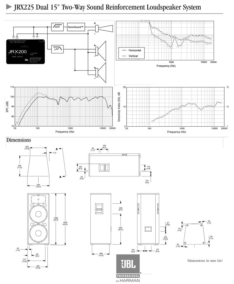双15"扬声器是迪斯科舞厅的大众化的一种配置,也是音乐家们期待具有更低频响特性的简单实用扬声器系统。JRX225实际上是一种“准三路扬声器系统”的设计。意味着低频扬声器覆盖了低频和中频频段,作为低音低扬声器使用。因此,这种双15"配置可在保持单驱动器优良的中频特性外,同时还可获得双15"配置的低频带特性。